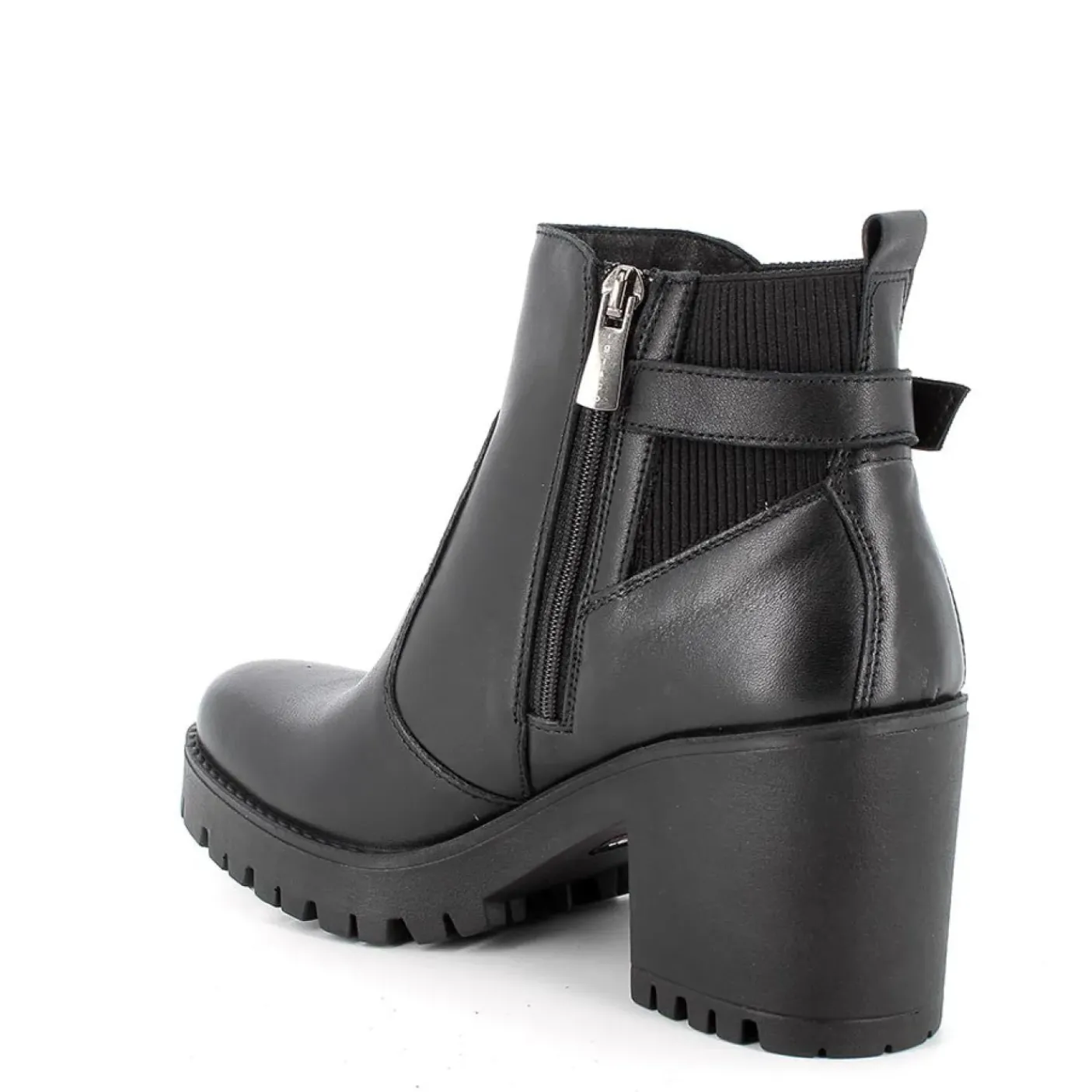 Stivaletto in morbida pelle nera, rivestito internamente in pelle. Elastico laterale e fibbia decorativa. Soletta estraibile. Chiusura con zip. Fondo gomma 8cm