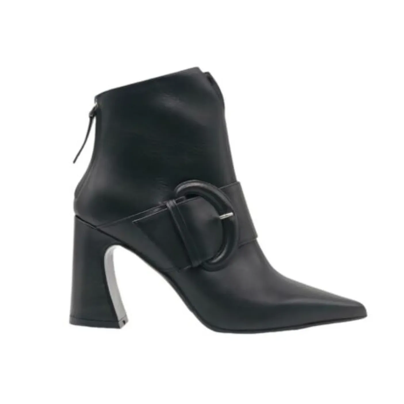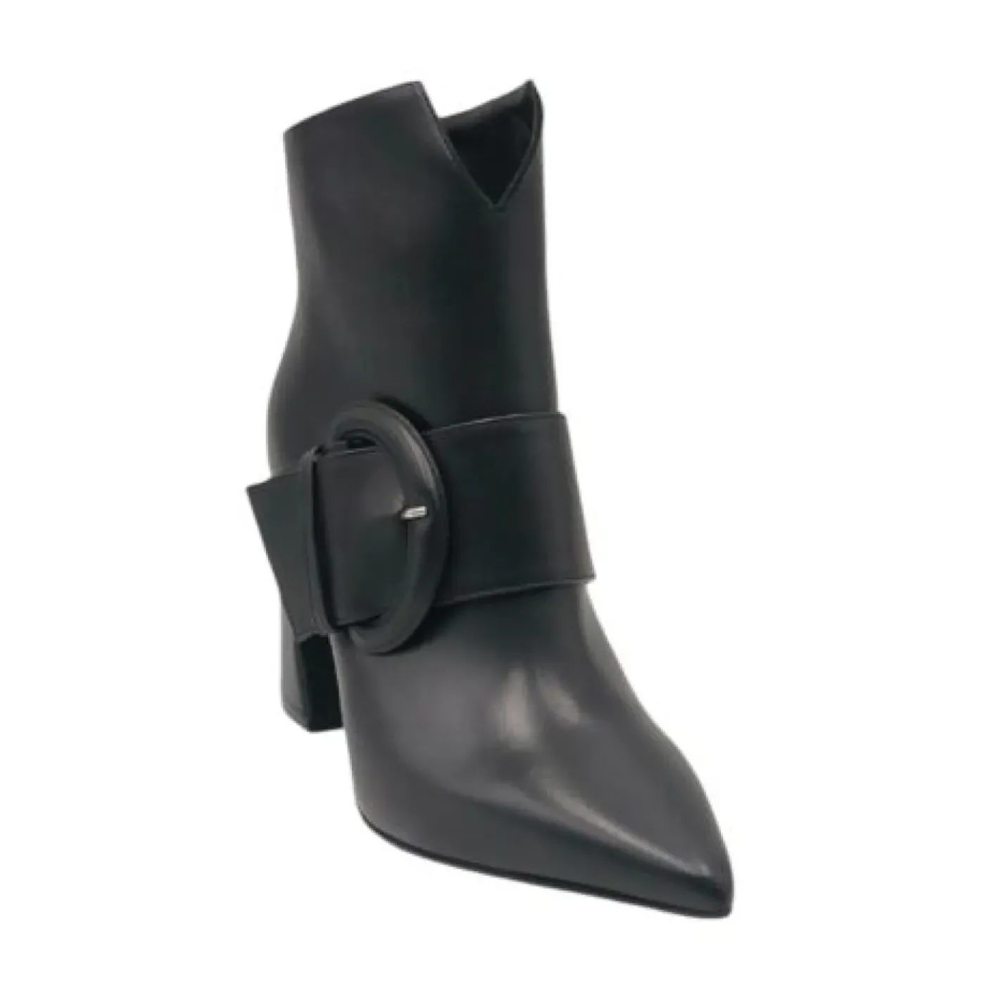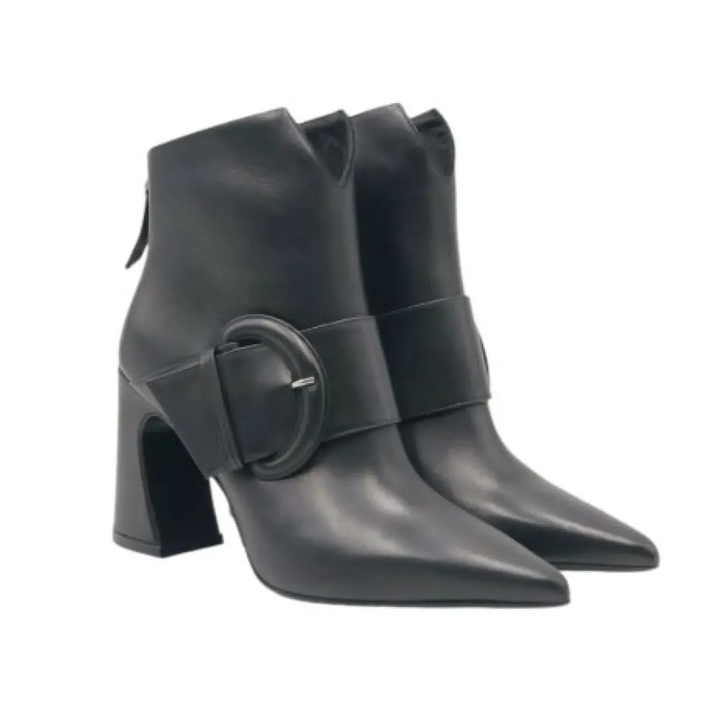 Stivaletti in vera pelle con fibbia maxi decorativa. Rivestito internamente in pelle. Chiusura con zip posteriore. Tacco squadrato 8cm