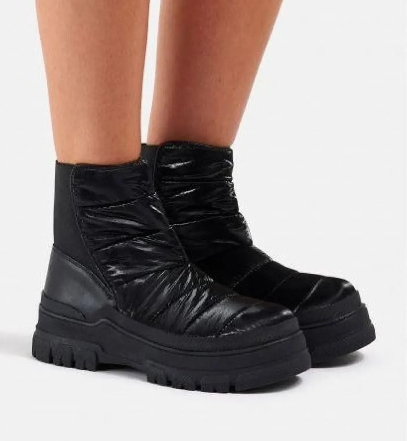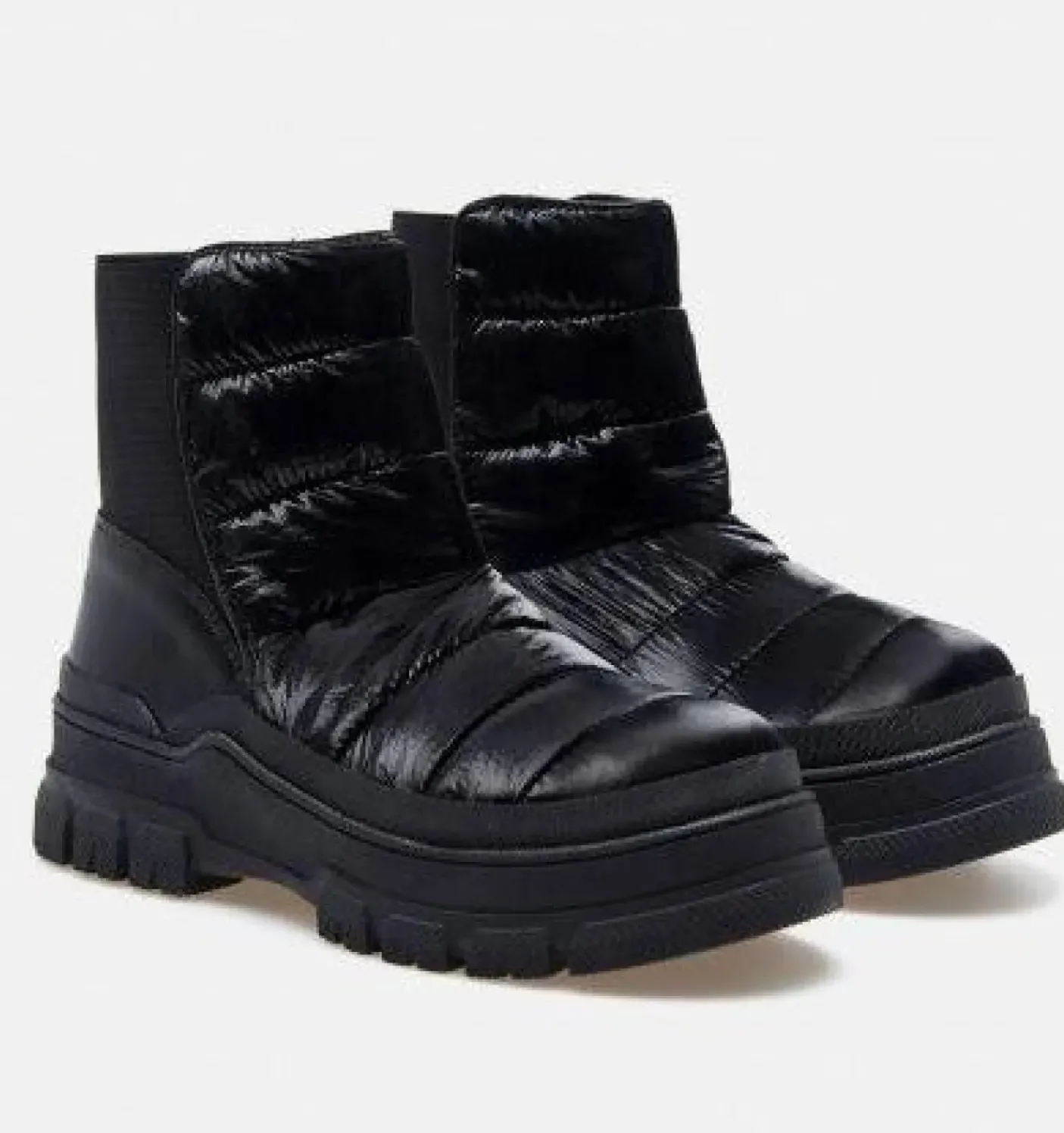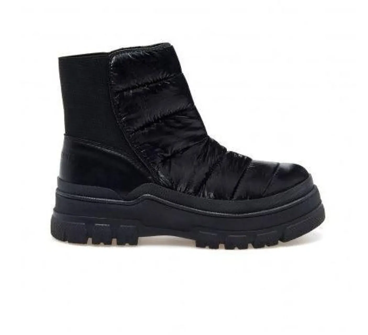 Stivaletti in tessuto lucido impermeabile imbottito con elastico sul retro. Fondo in gomma 5cm.