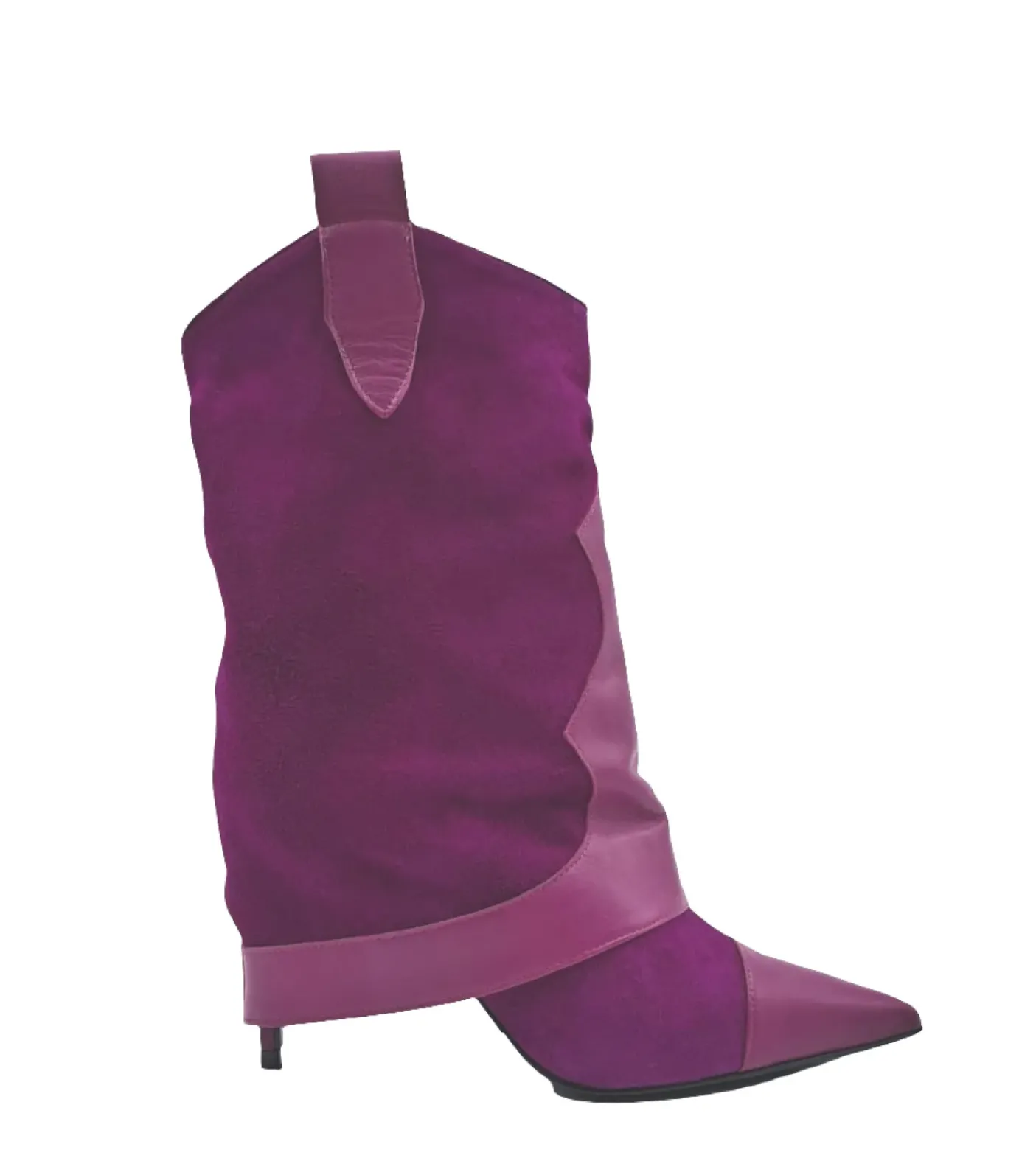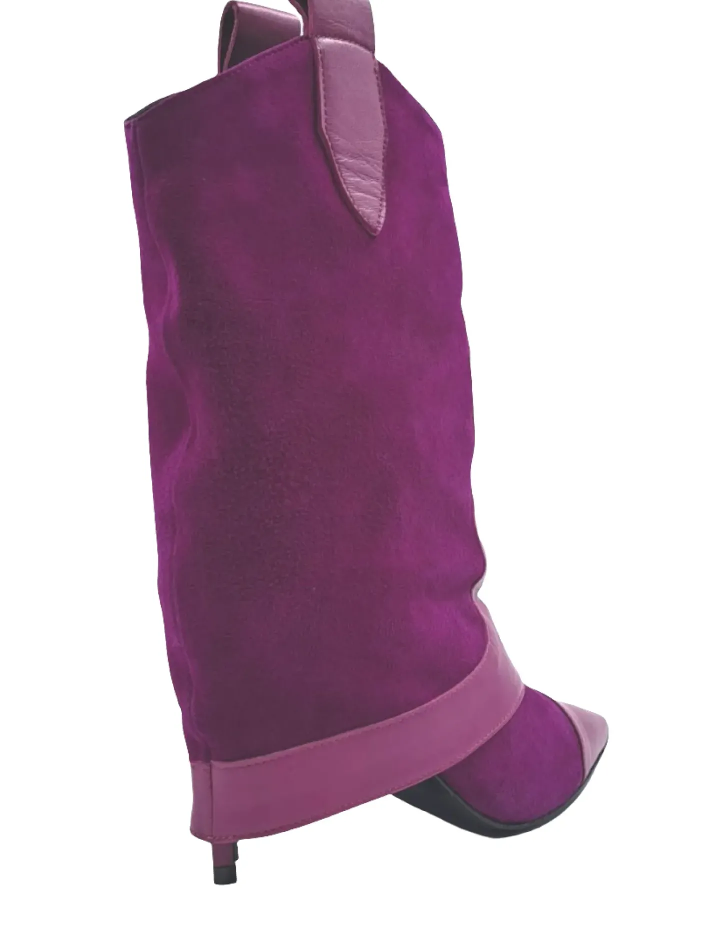 Stivali in vera pelle e camoscio con risvolto. Rivestito internamente in pelle. Soletta in pelle. Tacco a spillo rivestito 9cm.