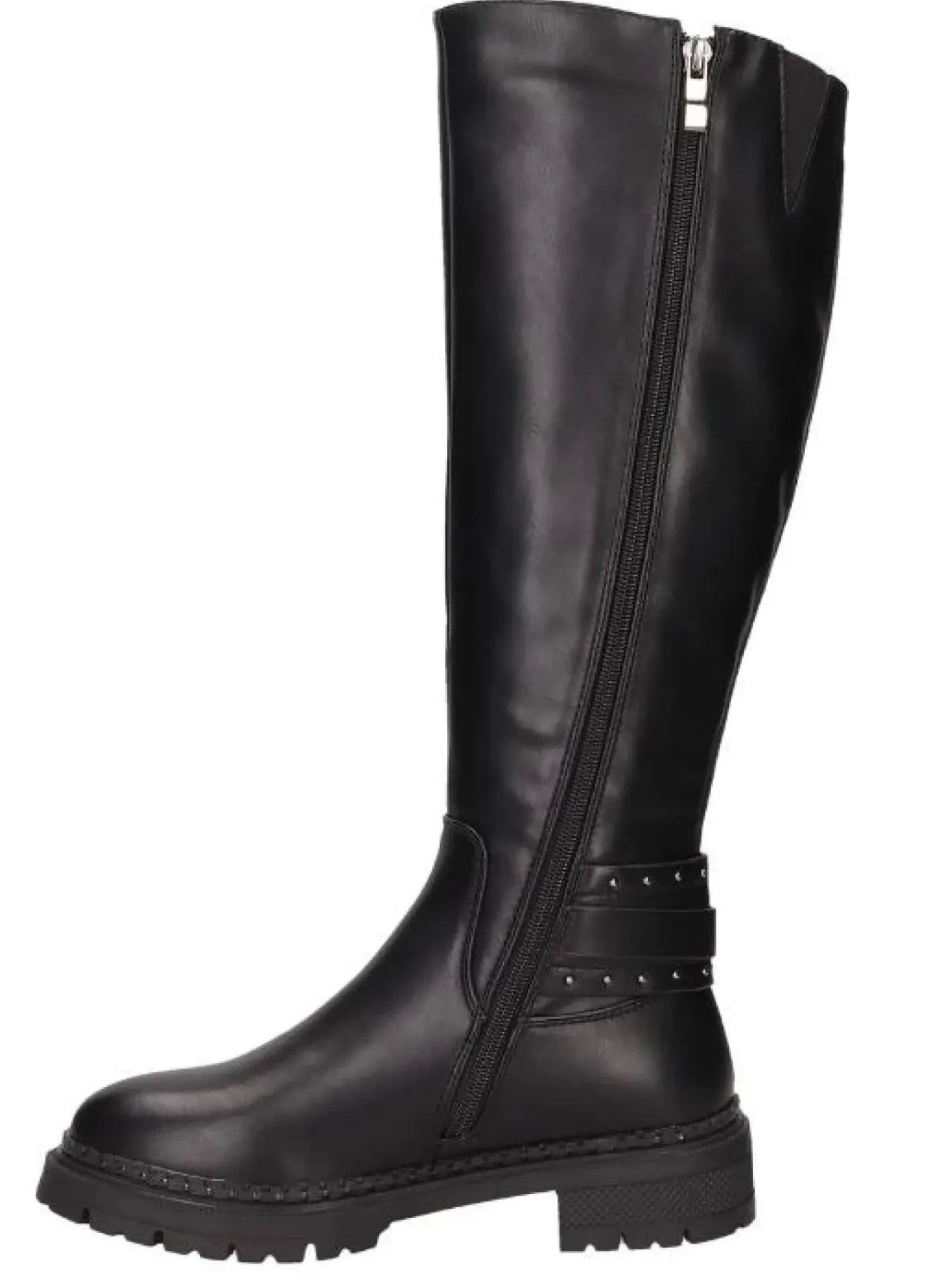 Stivale in ecopelle morbido, rivestito internamente in tessuto. Applicazione alla caviglia e cinturino regolabile. Chiusura con zip laterale. Fondo in gomma.