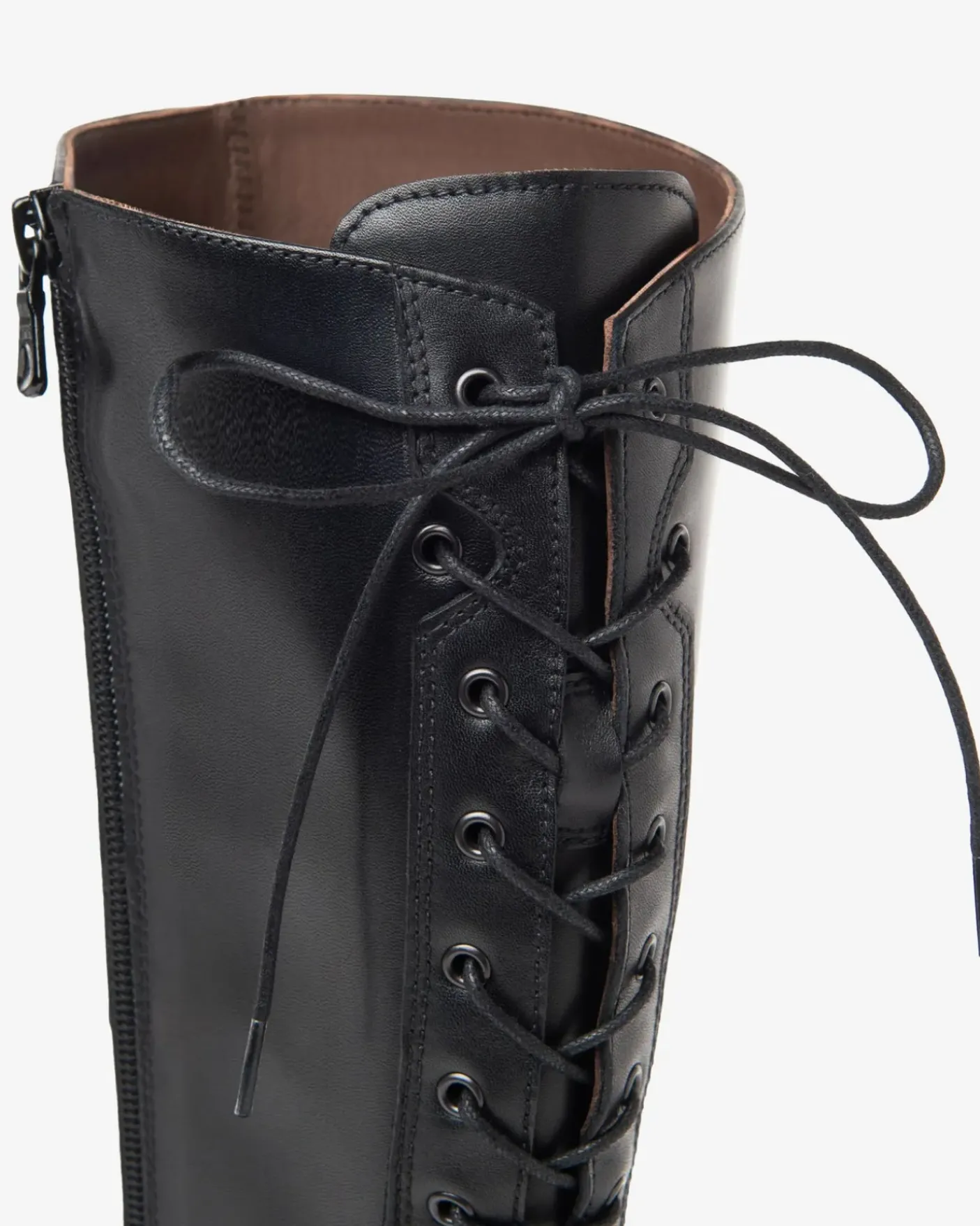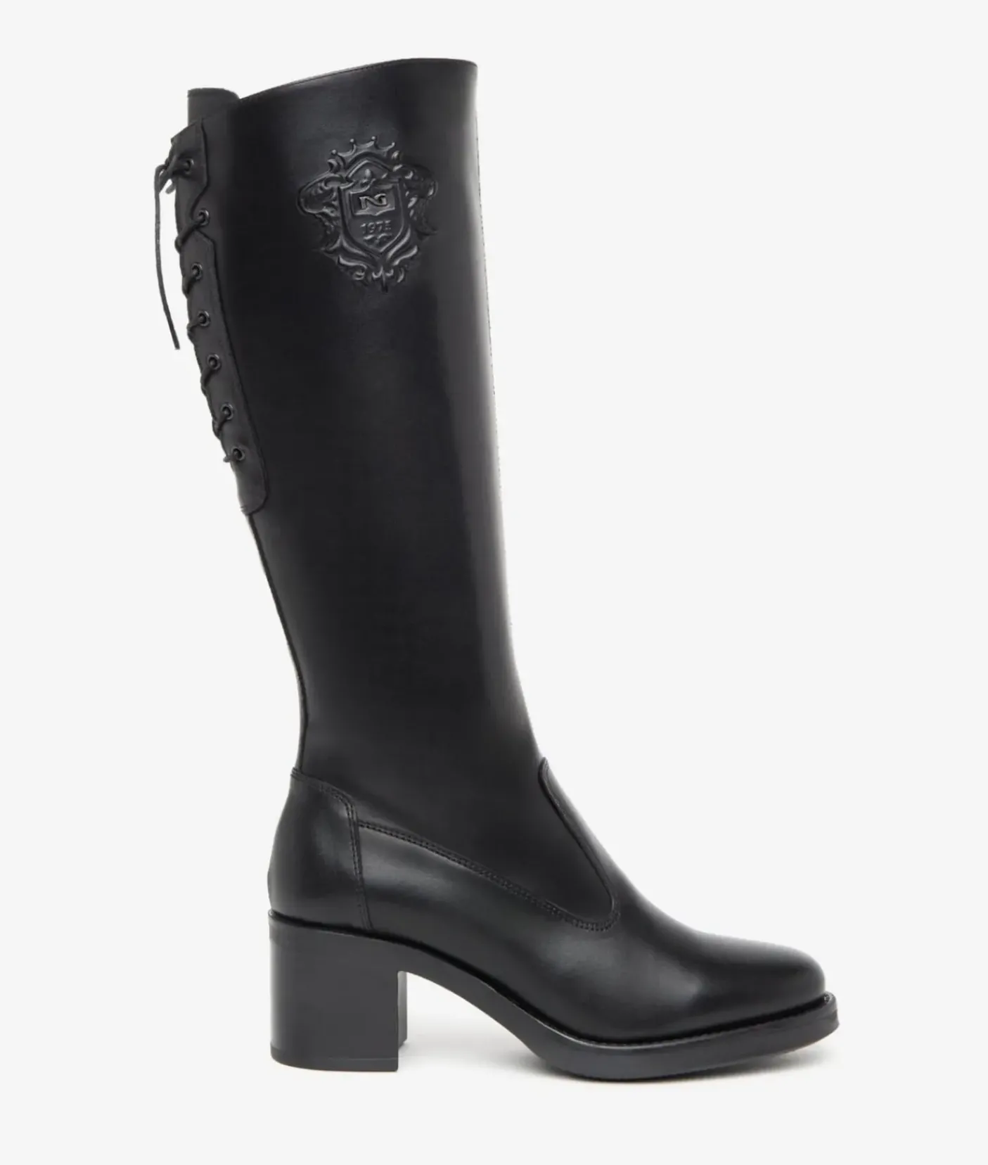 Stivali in vera pelle, rivestito internamente in pelle. Chiusura con zip e lacci regolabili posteriormente. Fondo gomma, tacco 6cm.
