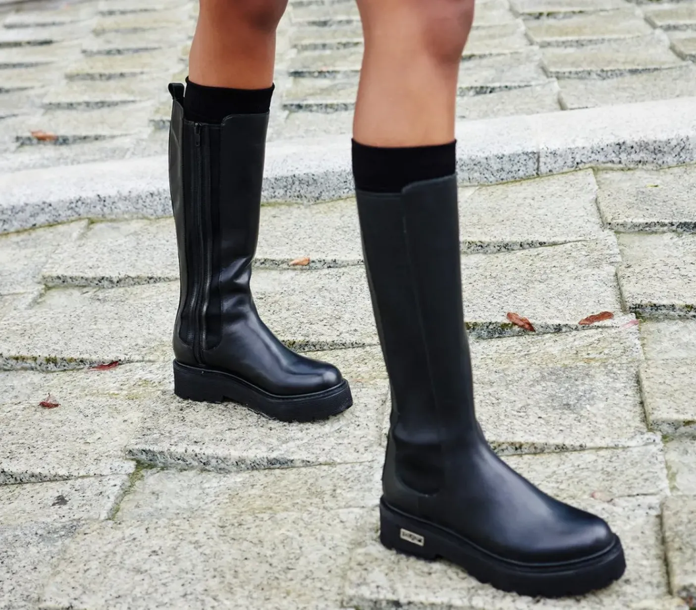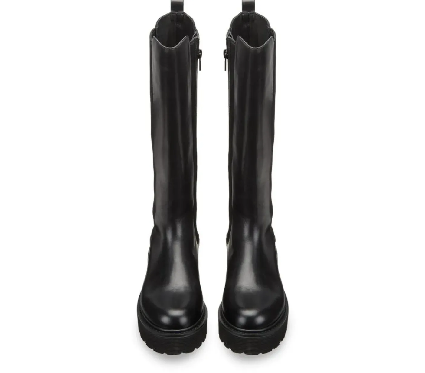 Stivali in pelle nera con elastico laterale e chiusura con zip. Fondo in gomma, suola a carrarmato.