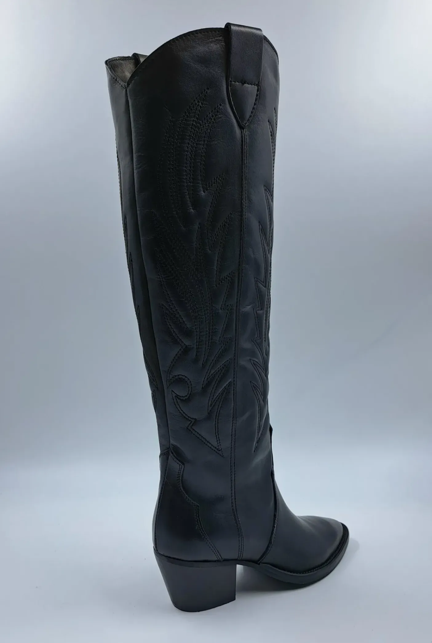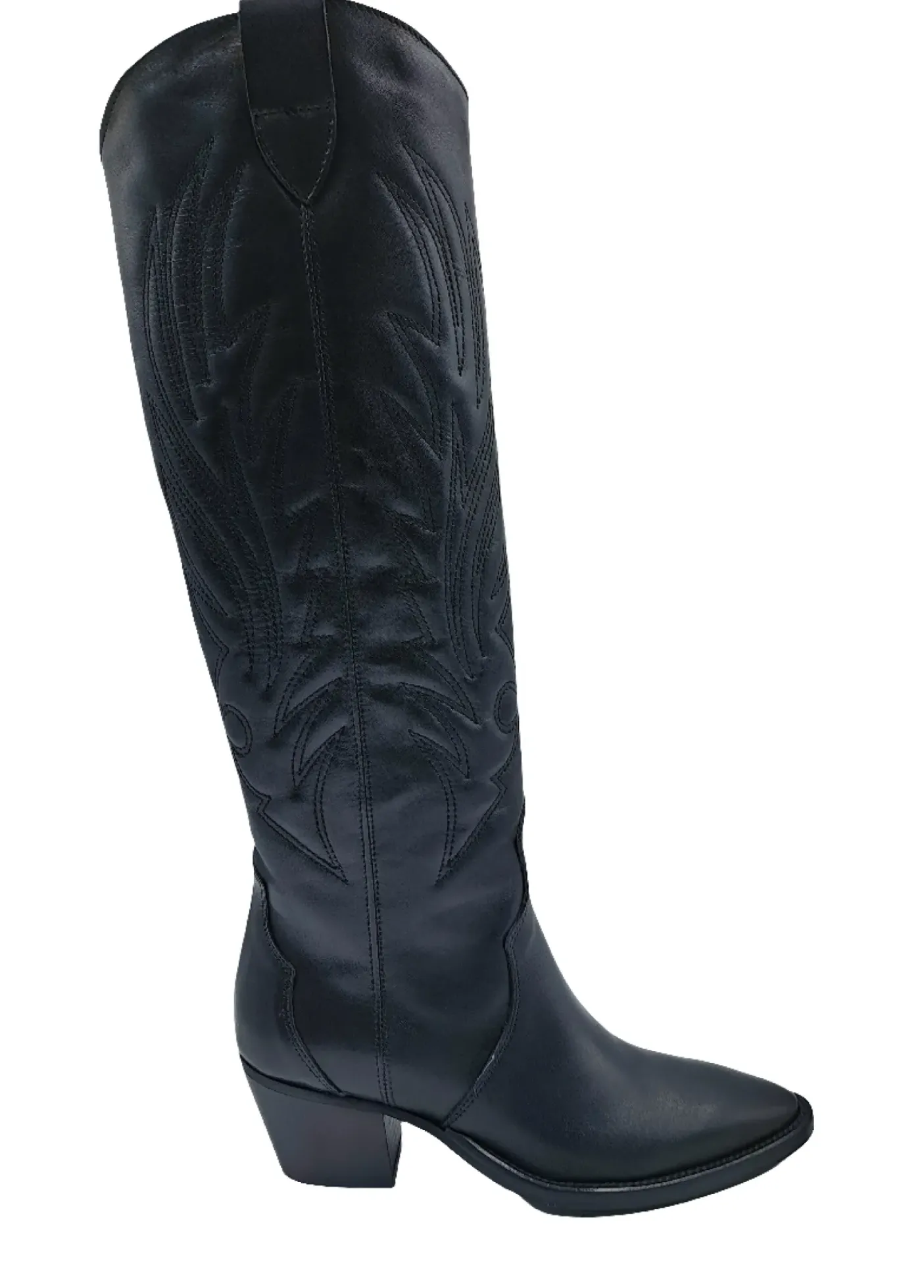 Stivali in vera pelle morbida con ricami. Rivestito internamente in vera pelle. Tacco 5cm. Gambale 40/43cm. Tiranti laterali decorativi.