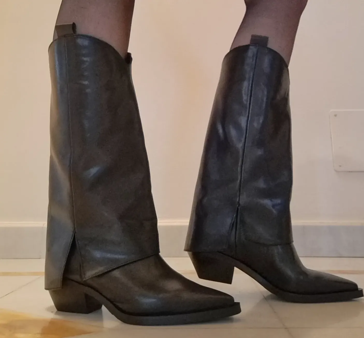 Stivali in vera pelle con risvolto in pelle. Rivestito internamente in vera pelle. Tacco 5cm. Gambale 30cm