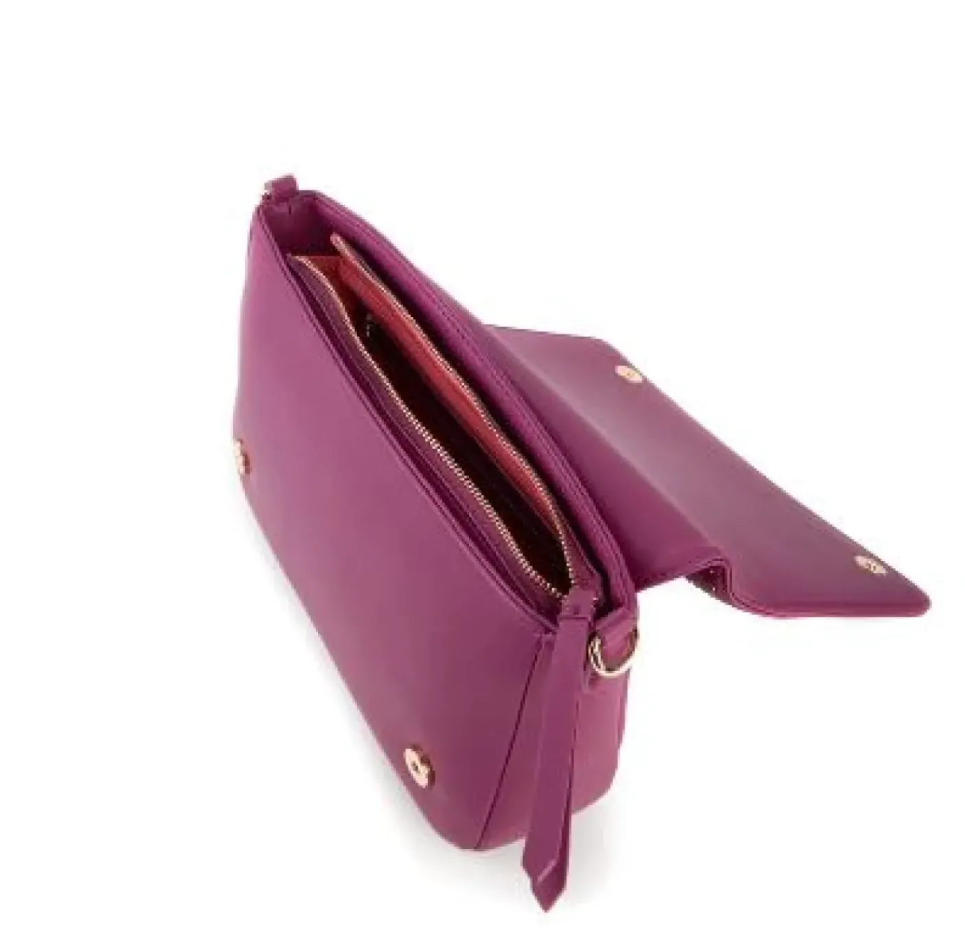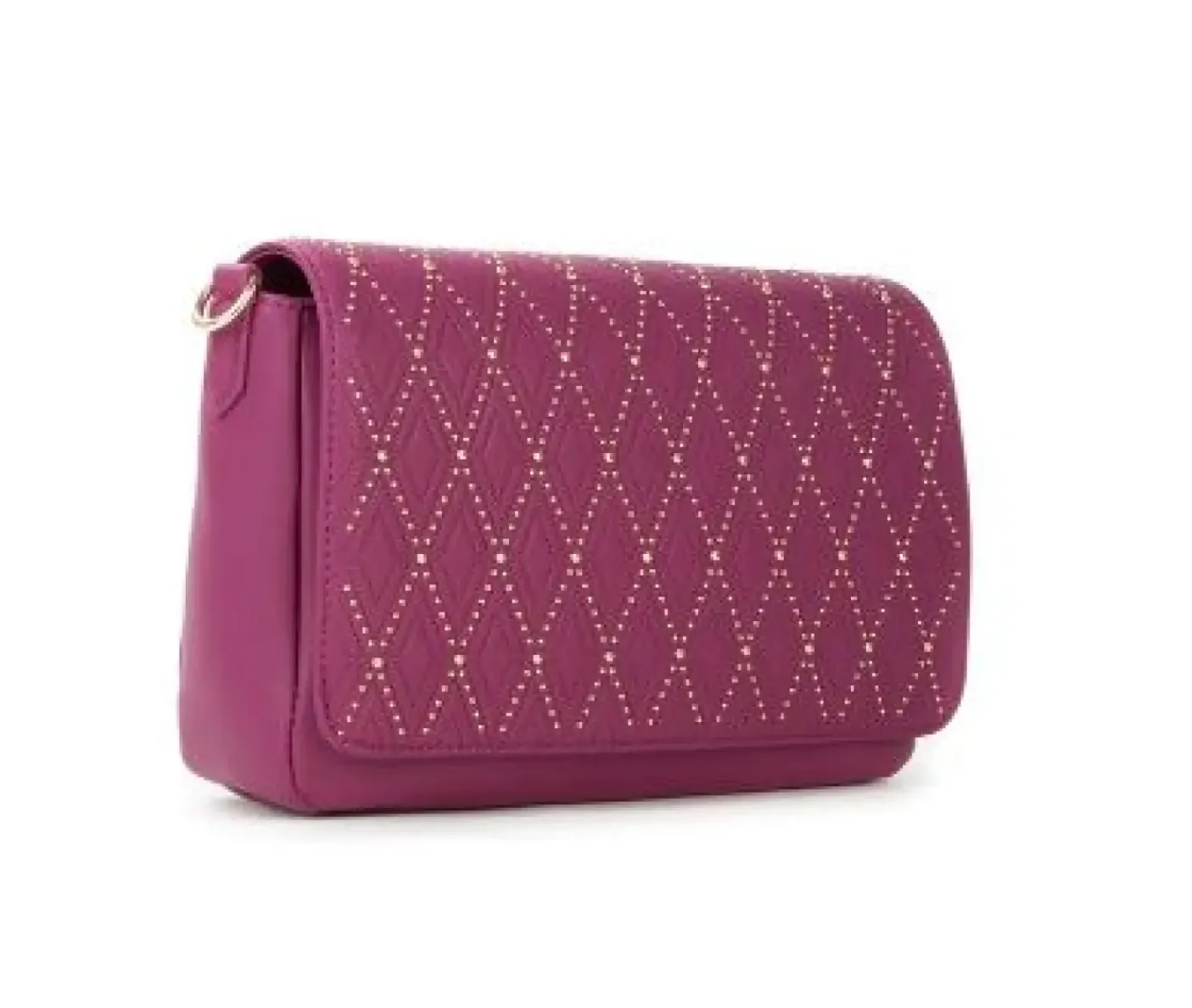 Tracolla in nappa malva con decorazioni geometriche in mini borchie gold. Tasca interna con zip. Chiusura con zip e patta con doppio clip. Tracolla regolabile.