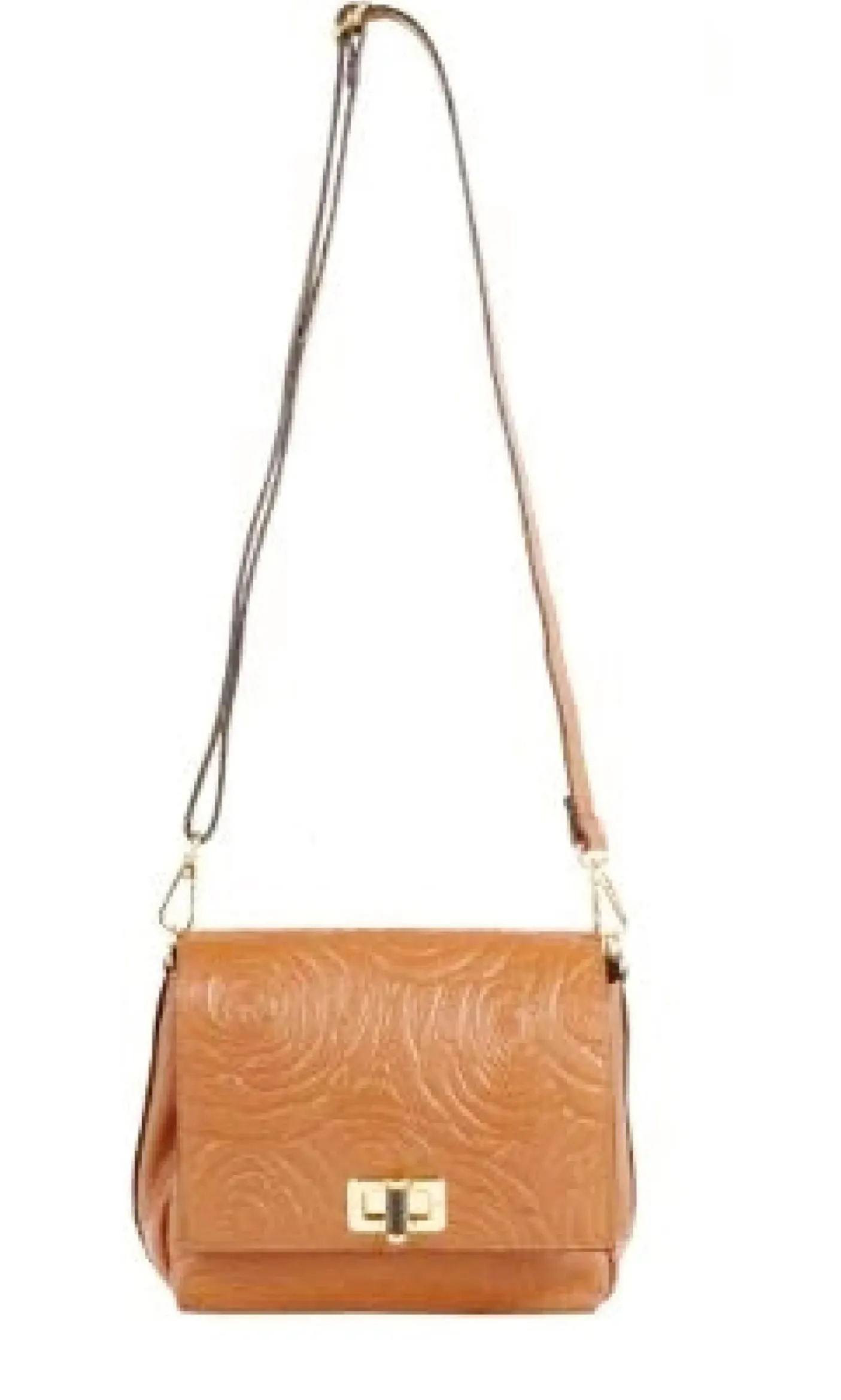 Tracolla in vera pelle morbida stampa a rilievo fiori, rivestita internamente. Tasca portaoggetti.. Chiusura con patta. Tracolla regolabili in pelle. Applicazioni metalliche decorative gold.