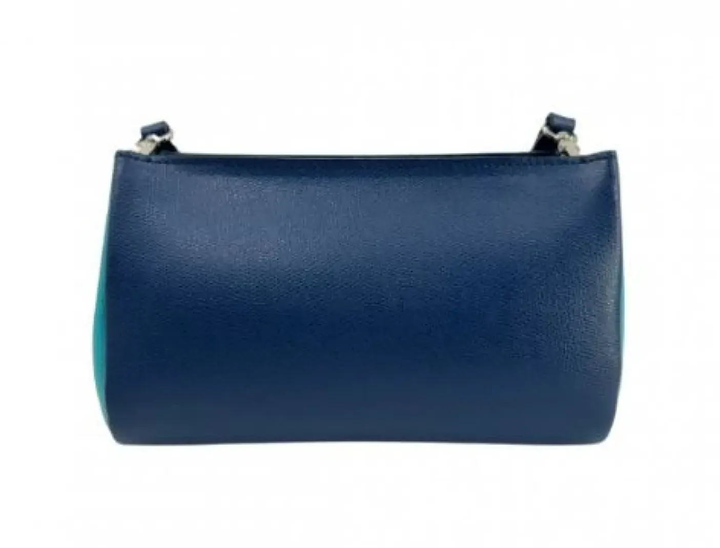 Tracolla in vera pelle blu e celeste. Chiusura con zip. Manico in pelle e tracolla in tessuto aportabile. Rivestita internamente e tasca portaoggetti con zip.