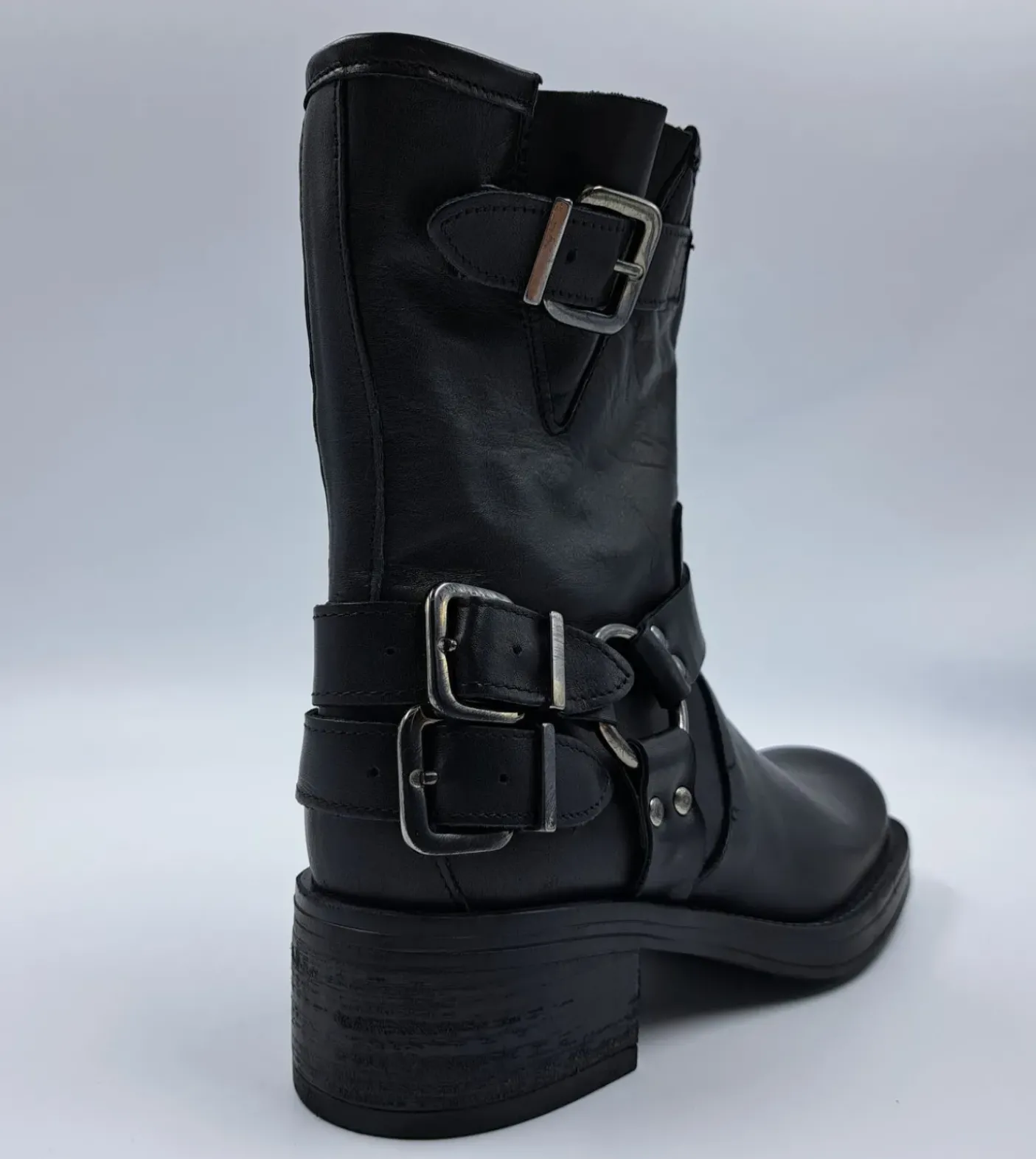 Stivali in pelle morbida modello biker. Fibbie metalliche laterali tallone. Punta squadrata. Gambale (misura dal tallone) 18cm. Fondo gomma tacco 4,5cm