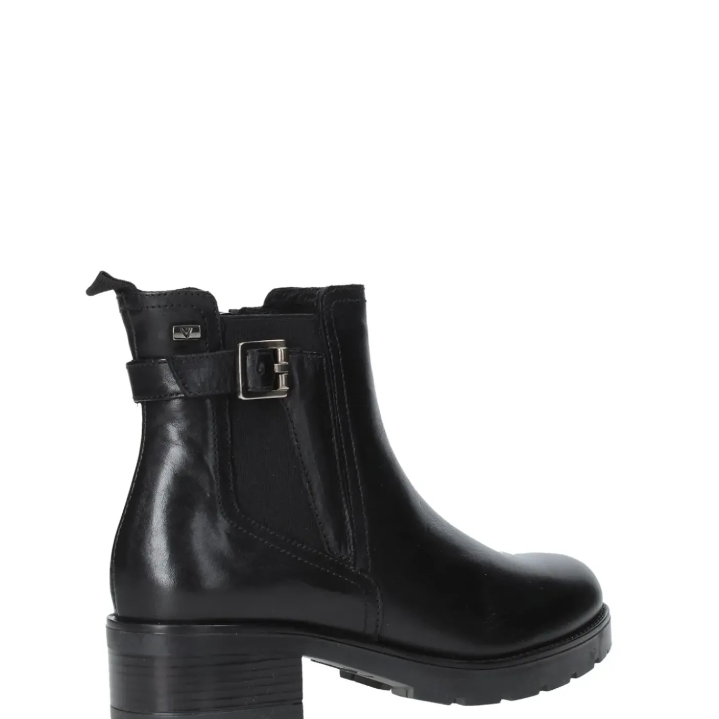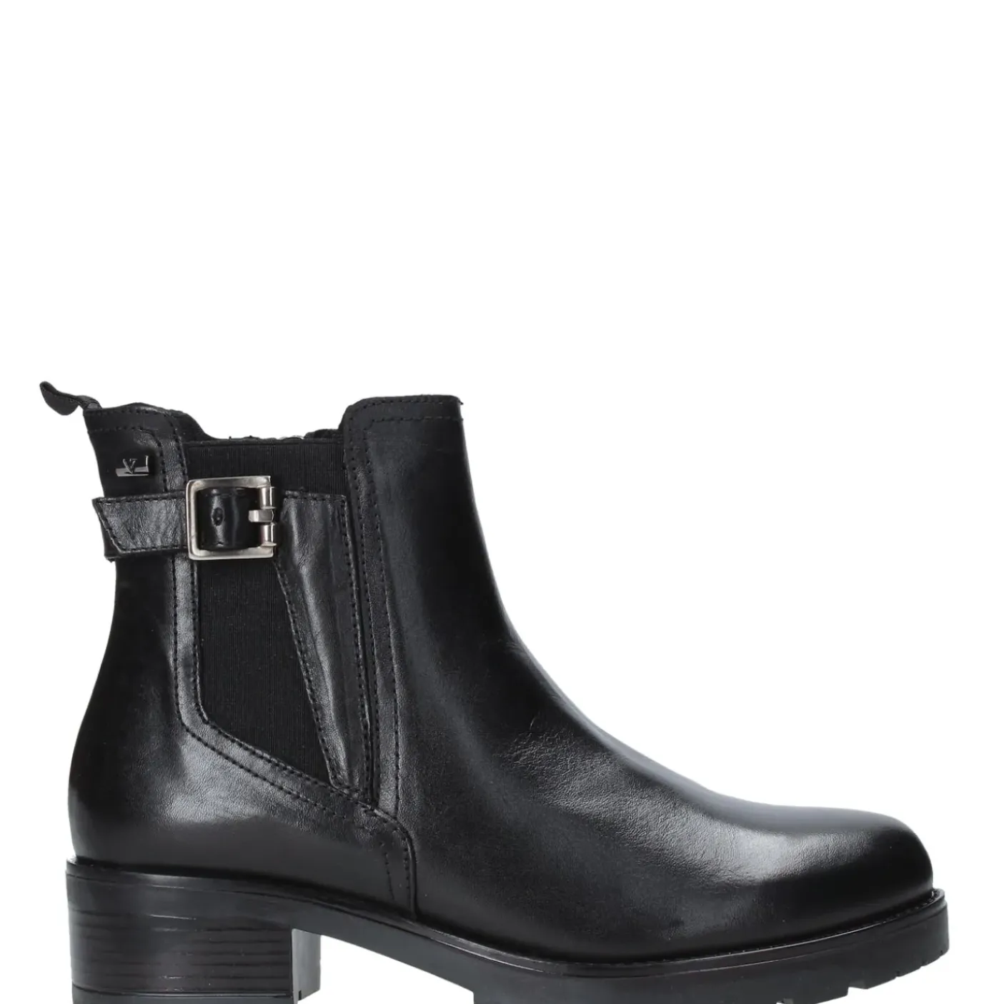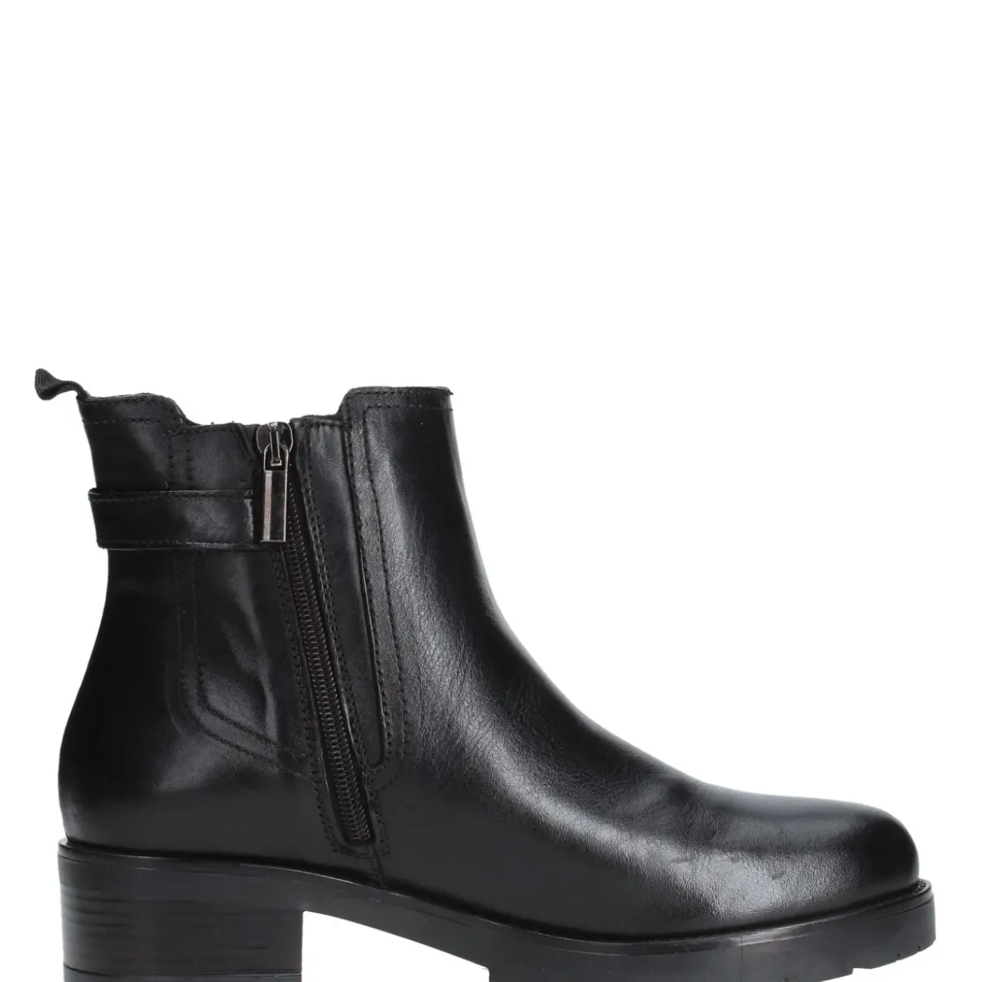 Tronchetto in pelle con elastico e cinturino decorativo. Rivestito internamente in tessuto con suoletta in cuoio. Fondo in gomma, tacco 4,5 cm