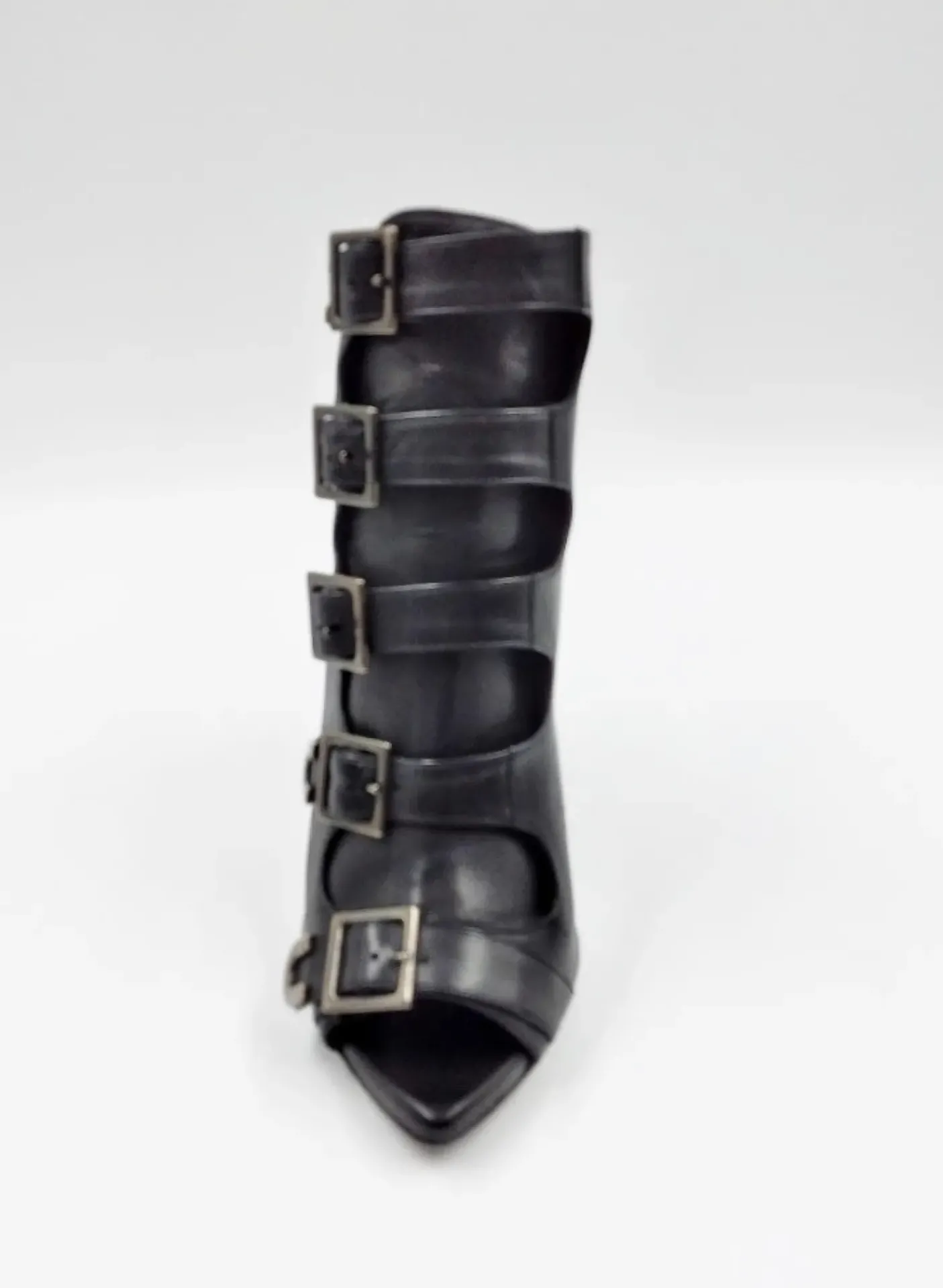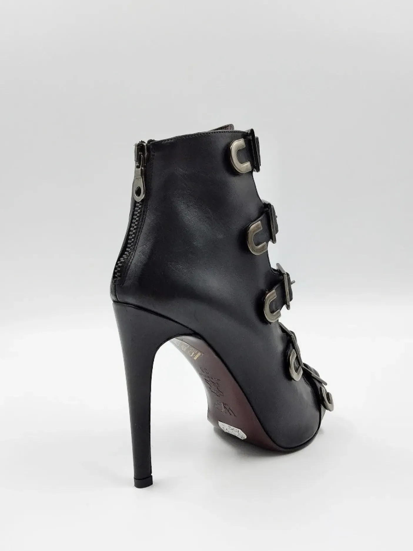 Tronchetti in pelle con fibbie decorative, chiusura con zip posteriore.