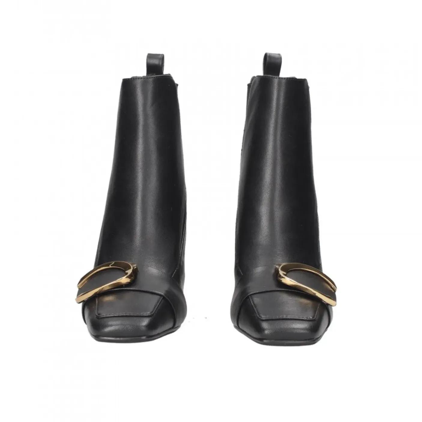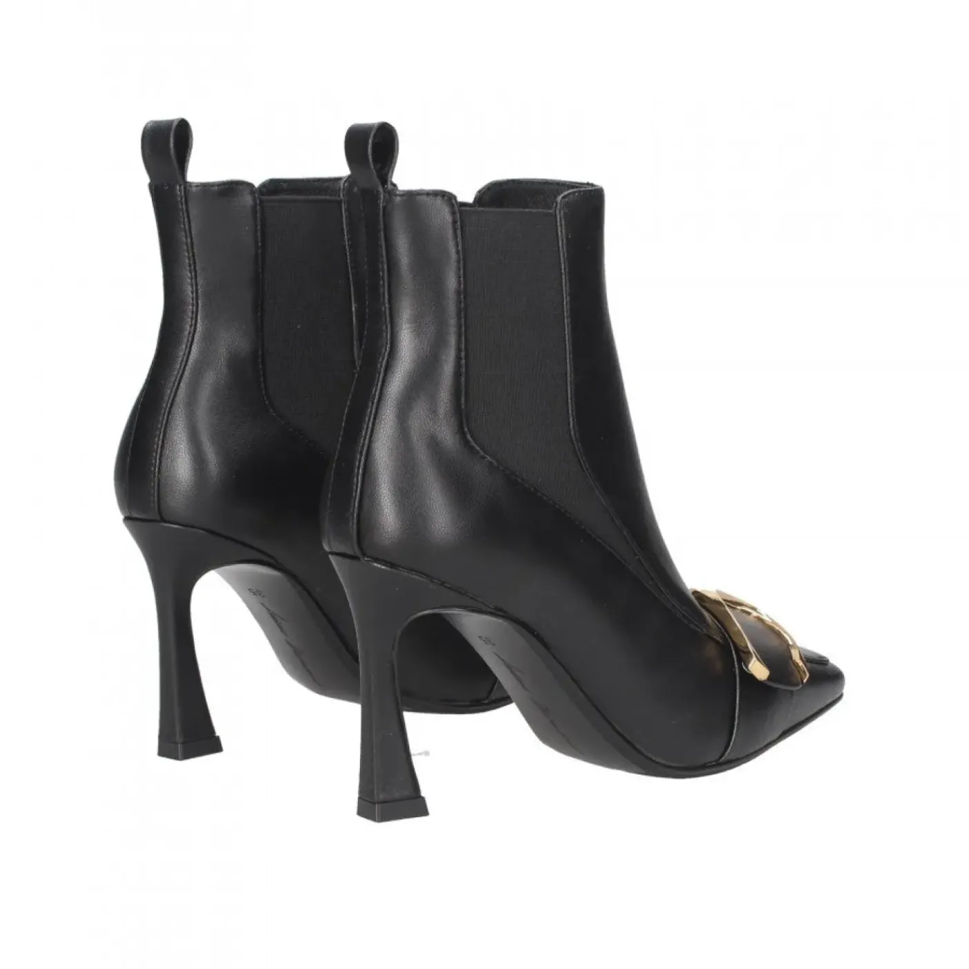 Tronchetto in pelle morbida con elastico sui lati, rivestito internamente in pelle. Decorazione metallica. Tacco a rocchetto 9cm