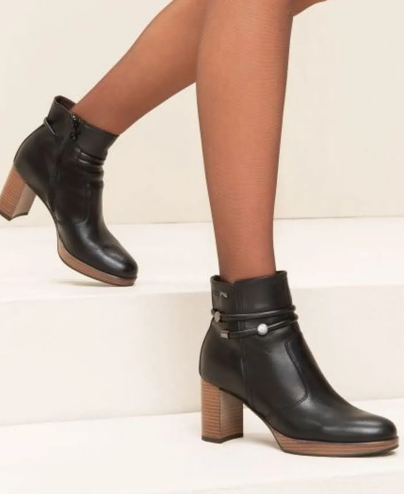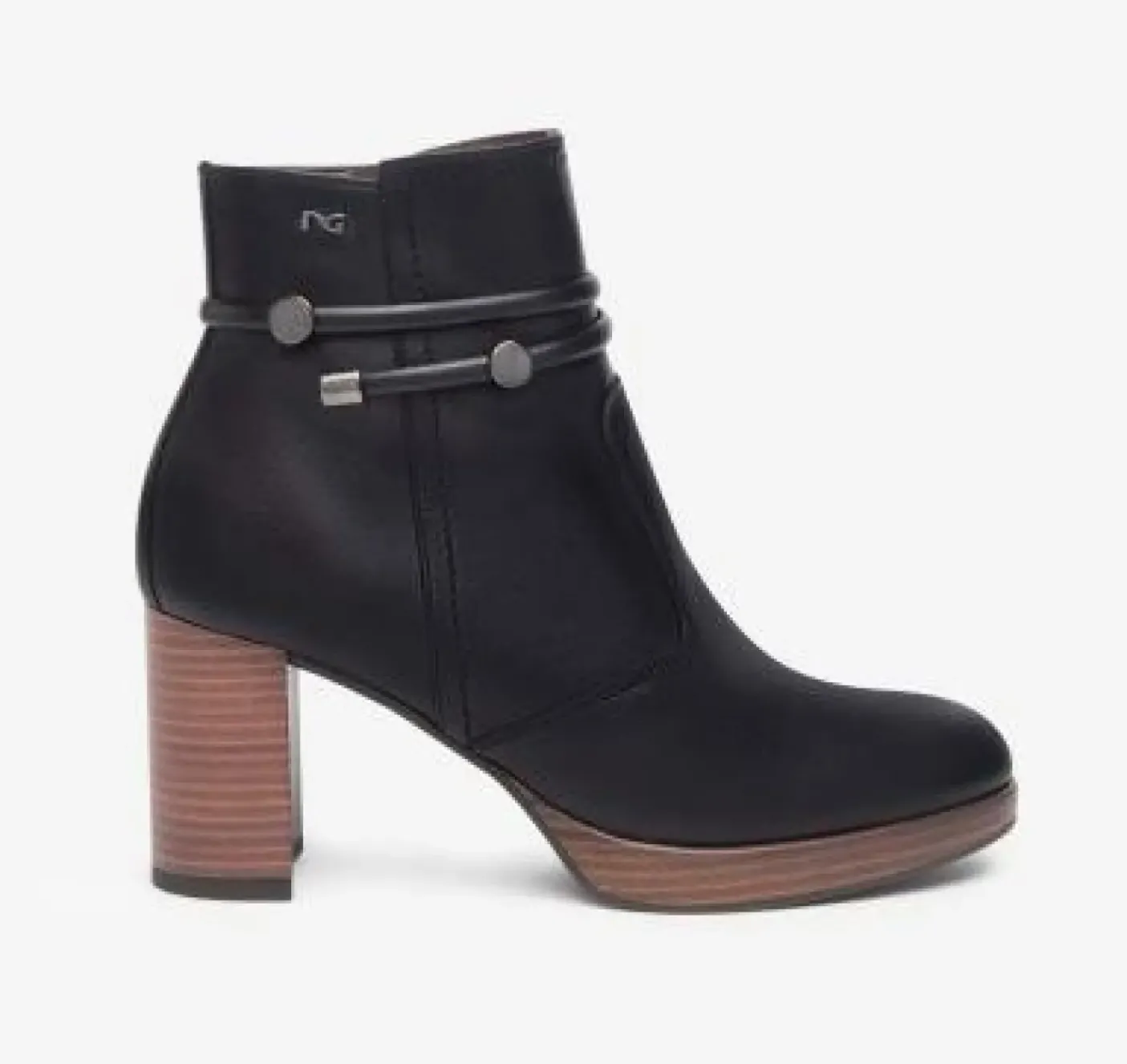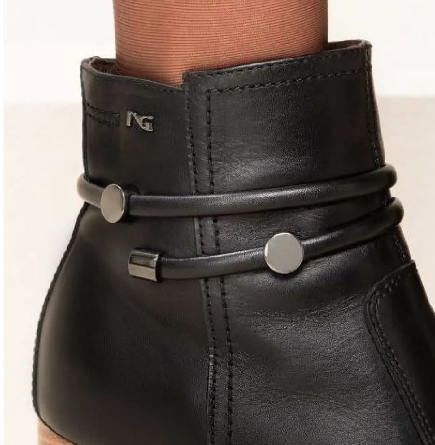 Tronchetti in vera pelle, rivestito internamente in pelle. Decorazioni lacci pelle alla caviglia con applicazione metallica. Logo laterale. Chiusura con zip. Fondo gomma tacco a contrasto 7,5cm